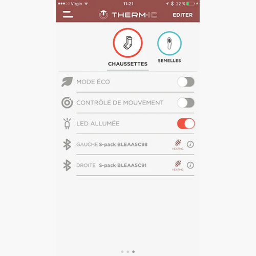 By clicking on the "Edit" button, you can modify the profile of your product or delete it. You can manually turn off your warmers or do so using the application by pressing and holding the "pause" button for 3 seconds. When the screen turns completely grey, your warmers are off. Just turn them on to get the screen working again. You can register a new pair of warmers. Simply click on the "+" button, connect your warmers and repeat the above mentioned steps.